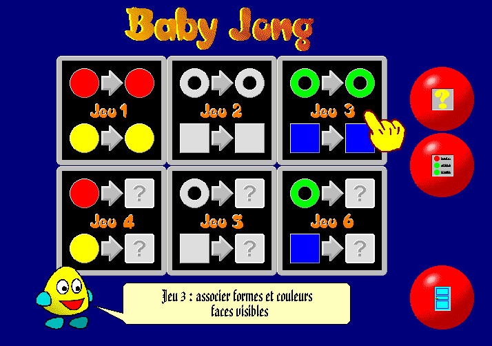 1611-JX Deux disquettes Shareware limité. Nom : BABY JONG (Win Novation) Matière : jeu éducatif. Niveau : maternelle. Utilisable dès 2-3 ans. L'enfant doit associer des formes et des couleurs avec faces visibles ou invisibles. Paramètrable. |
