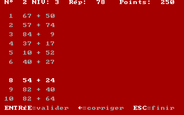 2115-MA Une disquette Freeware. Nom : CORN4 (Araste A.) Matière : maths. Niveau : école. Ce programme est destiné en priorité aux élèves de CE et CM. Il teste les connaissances et la rapidité du calcul mental dans les 4 opérations courantes avec 3 niveaux de difficultés. 250 points sont attribués par bonne réponse. Mais attention, 50 points sont retirés par réponse fausse et 10 points par seconde écoulée. |