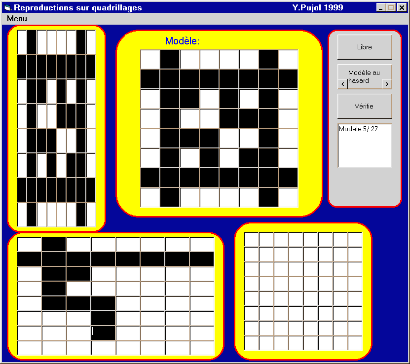 2213-MA Une disquette Freeware. Nom : QUADRILLAGE REPRO (Pujol Y.) Matière : maths, dessin. Niveau : maternelle, primaire. Une image est dessinée dans un quadrillage, l'enfant doit la reproduire sur des grilles de différentes tailles. Le bouton corriger indique les erreurs. Le logiciel contient 27 modèles, il est possible d'en créer d'autres. |