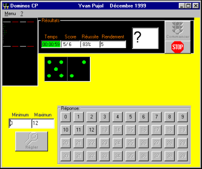 2217-MA Une disquette Freeware. Nom : DOMINO (Pujol Y.) Matière : maths. Niveau : maternelle, CP. Domino propose aux enfants de cliquer sur le bouton indiquant, en chiffres, le nombre de points d'un domino (ou plus) tiré au sort. On peut régler de 1 à 6 cases (soit de 1/2 à 3 dominos) et les minimun et maximum de points du tirage. |
