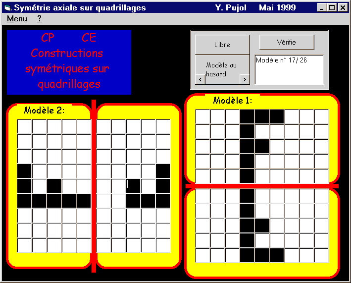3215-MA Une disquette Freeware. Nom : SYMETRIE AXIALE 1.0 (Pujol Y.) Matière : maths, dessin. Niveau : primaire. Symétrie Axiale permet de s'entraîner aux symétries par rapport à un axe horizontal ou vertical. L'enfant doit reproduire un dessin sur un quadrillage. Il y a déjà 26 modèles, on peut en créer d'autres. |