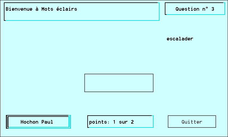 3311-FR Une disquette Shareware. Nom : MOTS ÉCLAIRS (Olmes P.) Matière : français. Niveau : école. Ce programme permet de travailler la rapidité de lecture, la mémoire visuelle des mots et l'orthographe. Un mot s'affiche à l'écran puis s'efface, l'élève doit le retaper. Le temps de lecture des mots est fonction des résultats, ceux-ci sont enregistrés et peuvent être imprimés (dans la version complète). |
