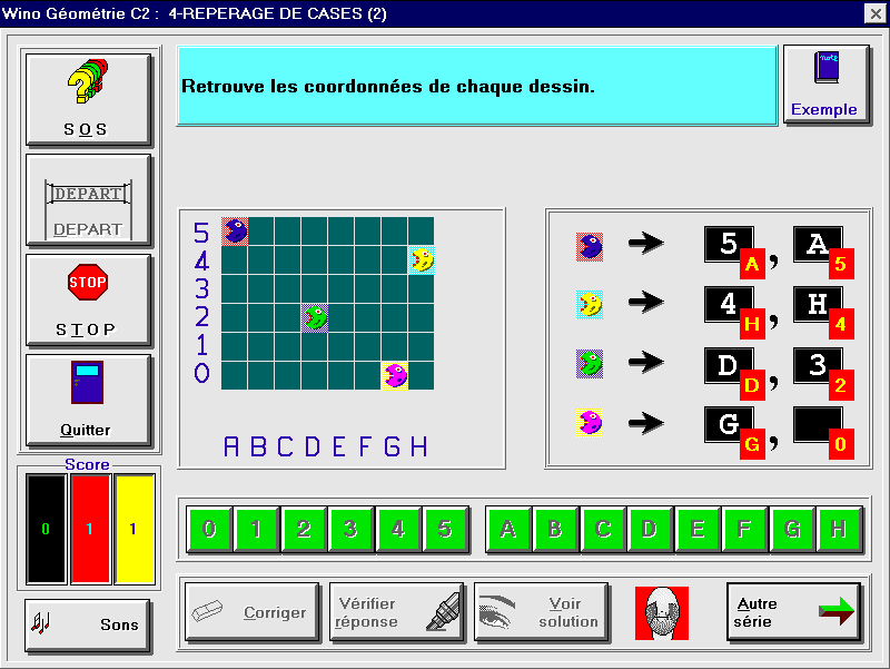 3612-MA Deux disquettes Shareware limité. Nom : WINO GEOM 2 (Win Novation) Matière : maths. Niveau : primaire cycle 2. Nombreux exercices sur l'étude de la géométrie en cycle 2 avec possibilité de chronométrage, impression des résultats, sauvegarde de l'environnement et des réponses |