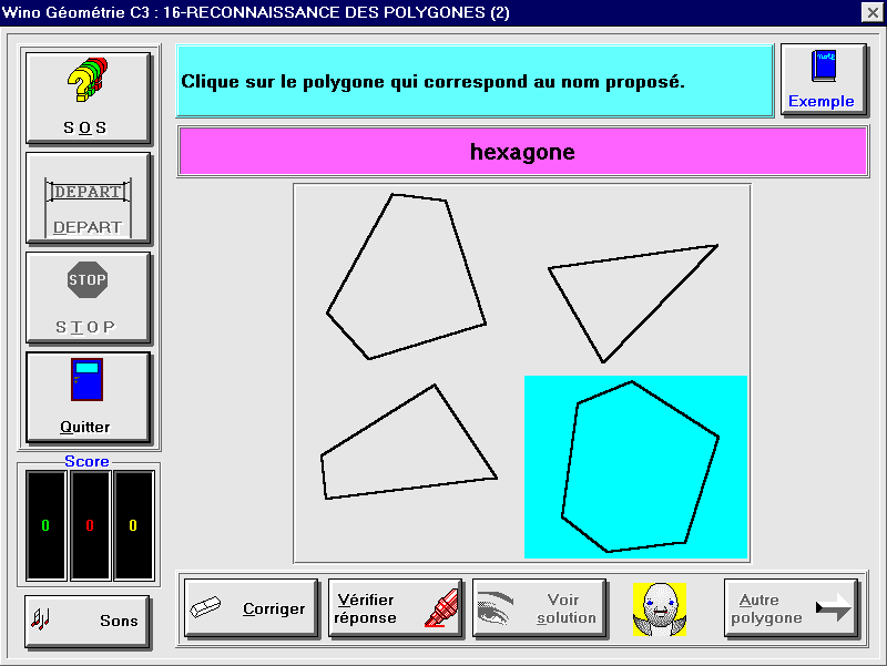 3613-MA Deux disquettes Shareware limité. Nom : WINO GEOM 3 (Win Novation) Matière : maths. Niveau : primaire cycle 3. Nombreux exercices (une trentaine) sur l'étude de la géométrie en cycle 3 avec possibilité de chronométrage, impression des résultats, sauvegarde de l'environnement et des réponses. |