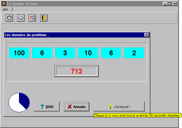 4413-MA Une disquette Shareware. Nom : CHIFFRES (Chambily A.) Matière : maths. Niveau : primaire, collège. Le jeu du " Compte est bon " comme si vous y étiez ! En outre Chiffres est capable de résoudre en temps réel des problèmes que vous lui posez. |