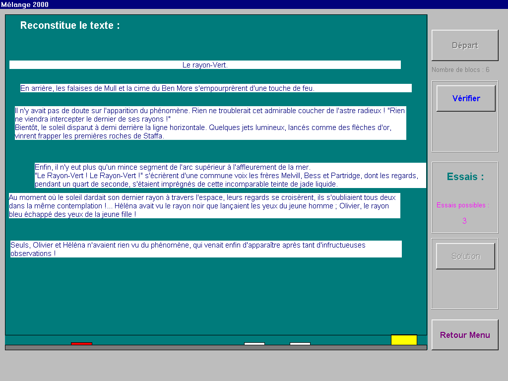 4421-LE Deux disquettes Shareware. Nom : MÉLANGES 2000 (Arc-en-logiciels) Matière : lettres. Niveau : primaire, collège. Outil à produire des puzzles de textes, permettant de créer, découper et présenter aux élèves des textes en désordre. Les blocs de textes sont déplacés à l'aide de la souris. Bilan, éditeurs de textes et de liste d'élèves. D'utilisateur, l'enfant peut devenir créateur et produire ses propres exercices qu'il pourra échanger ensuite... Nouvelle version de Mélange 98 (ex-réf. 4410-LE). |