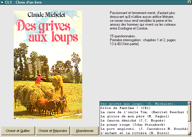 4610-FR Une disquette Shareware limité. Nom : CLS2-D1 (Campaner J.M.) Matière : français, lecture. Niveau : primaire, collège. Exploitation de lectures suivies, illustrations, questions, bilan, suivi, éditeur... (nombreux exemples fournis). |