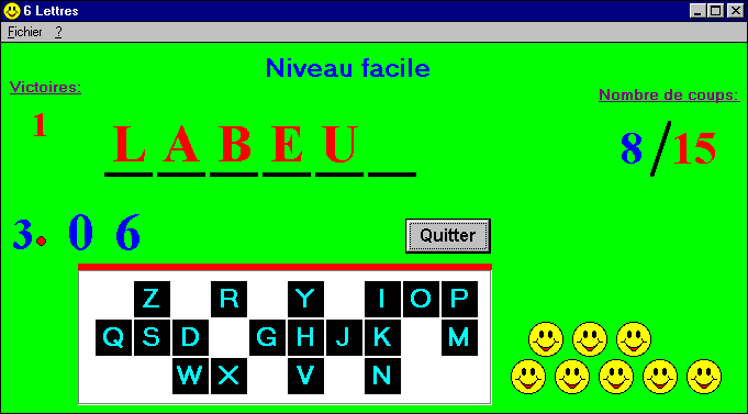 |  | 4613-FR   Une disquette Shareware limité. Nom : 6 LETTRES (Guerrault Y.) Matière : français. Niveau : primaire, collège. Jeu de type " pendu " où il faut trouver 10 mots de six lettres en 5 minutes, suivant le niveau 15, 12 ou 9 lettres peuvent être proposées par mot.  |