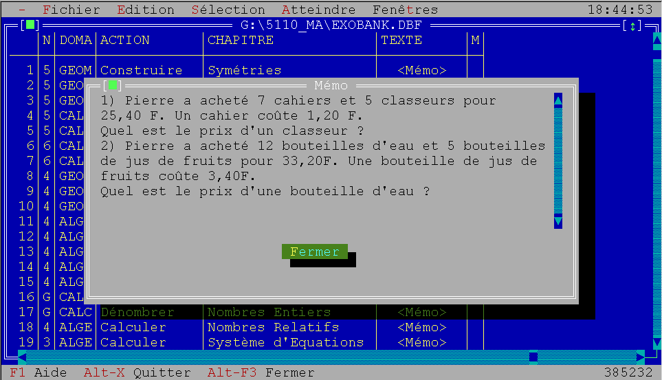 5110-MA Une disquette Freeware. Nom : TVBDOC (Kotstrzewa B.) Matière : mathématiques. Niveau : collège. Banque de 130 exercices de géométrie, algèbre, calcul, arithmétique, logique pour préparer cours et devoirs. |