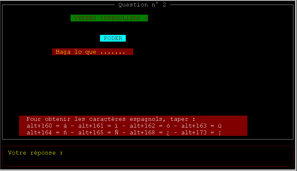 6119-ES Une disquette Freeware. Nom : EXOS-ESPA (Bernadoy A.) Matière : espagnol. Niveau : collège, lycée, BTS. 27 QCM ou exercices à trous avec aides ou rappels des notions de base réalisés sous GEN et QE. |