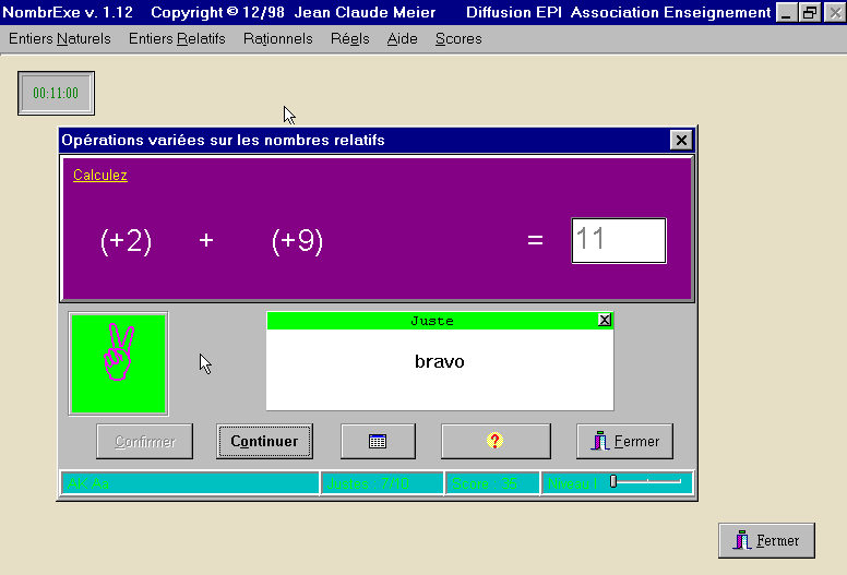 6218-MA Une disquette Freeware. Nom : NOMBREXE (Meier J.C.) Matière : maths. Niveau : collège, lycée. Nombreux exercices de niveaux variés sur les nombres. Entiers : calcul mental, opérations, multiples, nombres premiers, décomposition, jeux... Relatifs : opérations, parenthèses, jeu... Rationnel : simplification, opérations. Réels : écriture scientifique, équations 1er et 2ème degré, systèmes, inéquations, dérivées. |