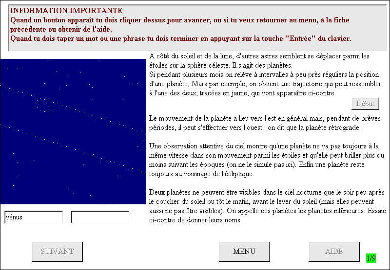 6222-SN Une disquette Freeware. Nom : SYSSOL (Dupré M.) Matière : astronomie. Niveau : collège, seconde. Le système solaire en quatre modules : - Le soleil, - Le jour et la nuit, - La lune, - Les planètes. Il est préférable de parcourir le premier module avant les trois autres qui sont indépendants. Dans chaque fiche il est possible de revoir la précédente, de revenir au menu ou d'obtenir des explications supplémentaires. |