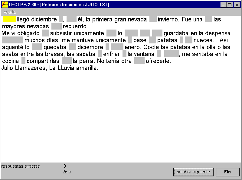 6415-ES Une disquette Shareware. Nom : LECTRA ESP (Brun M.) Matière : espagnol. Niveau : collège, lycée. Lectra est un logiciel d'entraînement systématique à la lecture, qui propose un ensemble d'exercices variés : closure, reconstitution de textes, lecture rapide... |