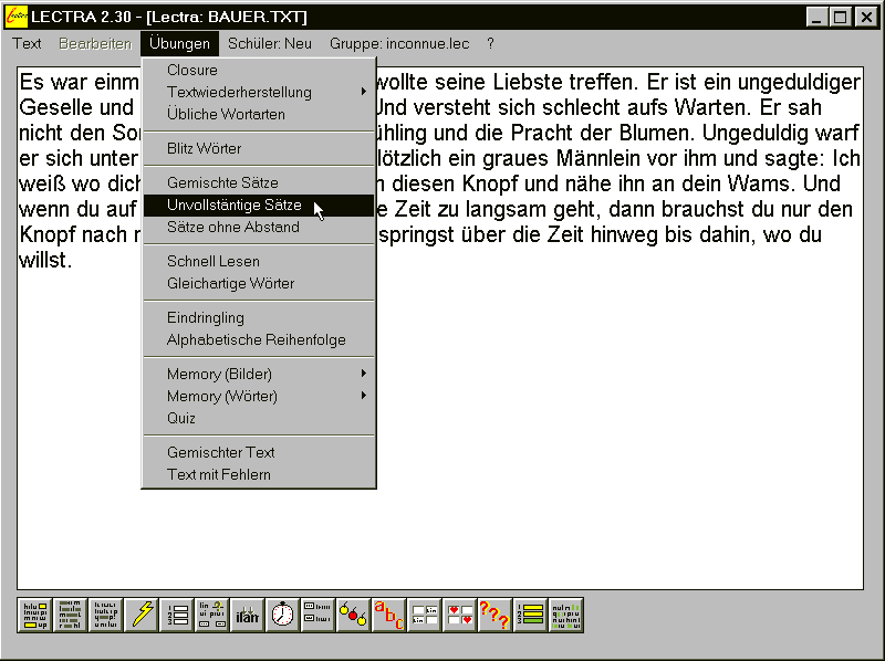 6416-AL Une disquette Shareware. Nom : LECTRA ALL (Brun M.) Matière : allemand. Niveau : collège, lycée. Lectra est un logiciel d'entraînement systématique à la lecture, qui propose un ensemble d'exercices variés : closure, reconstitution de textes, lecture rapide... |