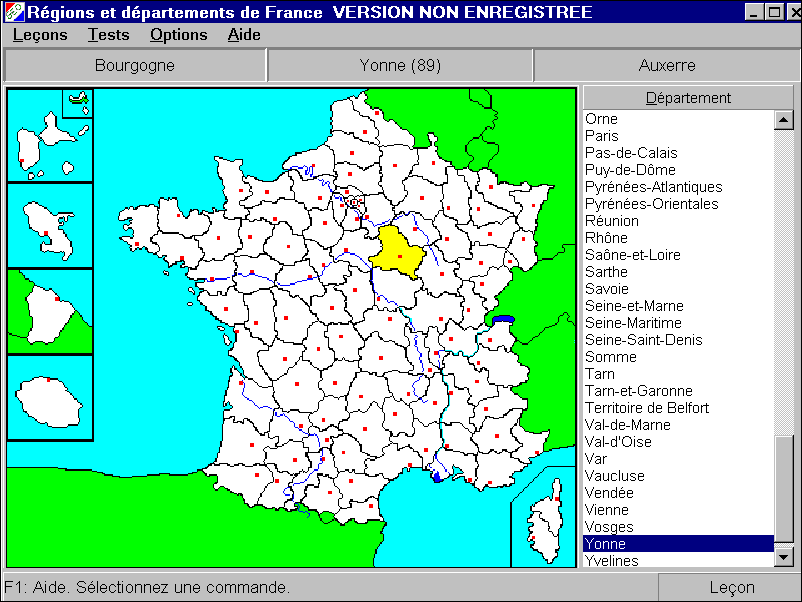 6418-GE Une disquette Shareware. Nom : GEOFRANCE 1.5 (Delattre T.) Matière : géographie. Niveau : collège, lycée. GéoFrance répertorie toutes les régions, départements, préfec-tures régionales et départementales, de France y compris des DOM-TOM. Il inclut deux modules, un pour l'apprentissage, l'autre pour les tests. On peut paramétrer quelques options comme le temps de réponse et le droit à l'erreur. GéoFrance est gratuit pour les établissements d'enseignements. |