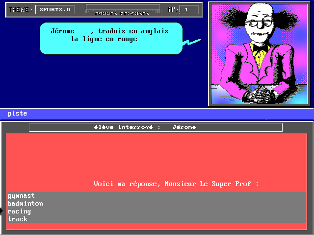 6511-AN Une disquette Shareware limité. Nom : SUPERPROF v.4.0 (Pithon D.) Matière : anglais. Niveau : collège, lycée. Logiciel ouvert (éditeur), exercices de vocabulaire, phrases, thème, jeu du pendu. |