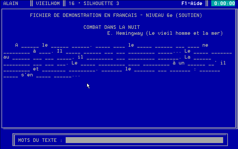 6710-FL Une disquette Version de démonstration limitée. Nom : ALFY (Logédic) Matière : lettres, langues. Niveau : collège, lycée. Exerciseur qui à partir d'un texte propose une dizaine d'exercices de difficulté croissante avec variantes. |