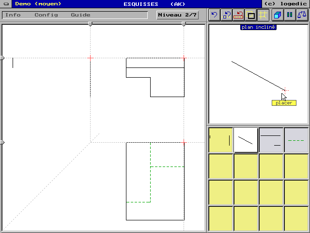 6715-TE Une disquette Version de démonstration limitée. Nom : ESQUISSES (Roy D., Logedic) Matière : technologie, dessin. Niveau : collège, ens. professionnel. Entraînement au dessin technique. Sept niveaux, détaillant les difficultés de façon graduée : reconstitution de vues incomplètes ou manquantes, en référence aux parties déjà dessinées et à la vue en perspective (angle variable) de l'objet. Possibilité d'afficher les lignes de projection. |