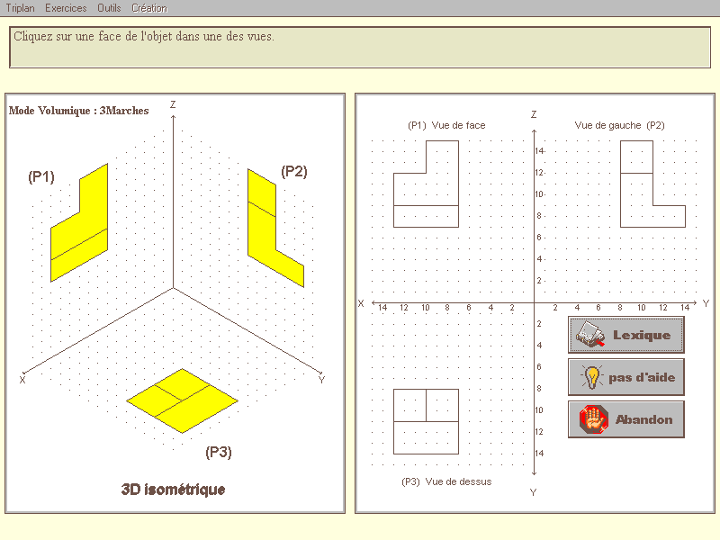 6811-TE Une disquette Version de démonstration limitée. Nom : TRIPLAN (Logedic) Matière : technologie, dessin. Niveau : collège, ens. professionnel. De la représentation volumique d'un objet à ses vues en plan. On amène l'élève à décomposer, puis à recomposer l'objet, lui permettant l'assimilation des mécanismes de représentation mentale nécessaire à la perception et à la conceptualisation des volumes dans l'espace, il acquiert aussi les réflexes de codage liés au système de projection. |