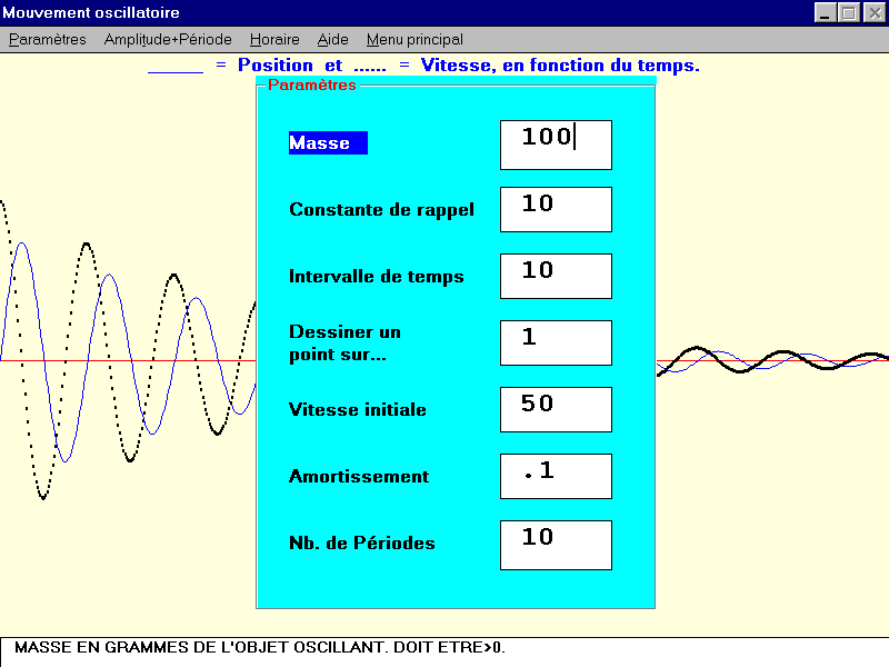7211-PH Une disquette Freeware. Nom : CINÉMATIQUE (Veuve M.) Matière : physique. Niveau : lycée et plus. - Balistique : Visualisation de la trajectoire et de l'horaire calculé par la méthode de Newton d'un boulet de canon. Affichage paramétrable par modification des données (angle, vitesse, accélération, vent, etc.). |