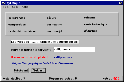 7218-FR Deux disquettes Freeware. Nom : STYLISTIQUE (Le Du G.) Matière : français, lettres. Niveau : lycée et plus. Stylistique est un logiciel d'apprentissage des termes de la stylistique française. Des séries d'entraînement vous sont proposées ainsi que des séries aléatoires permettant de chiffrer vos performances. Une aide sous forme de vocabulaire expliqué est autorisée pour les séries d'entraînement. Enfin, un grand hypertexte peut être imprimé, afin d'effectuer chez vous un travail préliminaire de recherche sur tous ces termes un peu compliqués. |