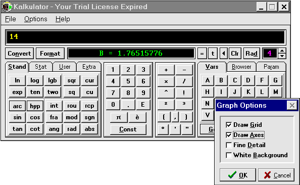 7412-MA Une disquette Shareware. Nom : KALKULATOR (Wrotniak) Matière : maths. Niveau : lycée ou plus. Simulation d'une calculatrice scientifique et graphique très sophistiquée. Ce programme d'origine polonaise, en version US limitée à 30 jours, offre les fonctions classiques, statistiques (distributions et variables aléatoires gaussiennes, laplaciennes, binomiales, chi2...), calculs polynomiaux, vectoriels, matriciels... |