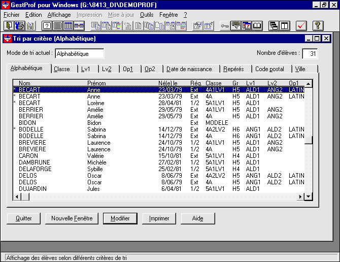 8413-DI Une disquette Shareware. Nom : GESTPROF 5.02 (Bécart C.) Matière : gestion de notes. Niveau : prof.. Logiciel de gestion de notes. Gère jusqu'à 9 999 élèves (99 pour la version shareware) dans 99 classes, nombreux critères de tri et de sélection, édition de listes, de récapitulatifs, de graphiques..., possibilité d'éditer et d'expédier des bulletins de notes..., possibilité de créer la base par importations des données de GEP, exportation au format DBase, etc. |