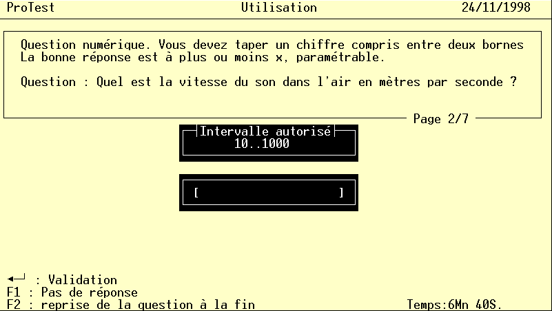 9111-EX Une disquette Freeware. Nom : PROTEST (Grégoire L.) Matière : exerciseur. Niveau : tout niveau. Protest est un programme pour créer et utiliser des questionnaires sur des sujets variés. Il permet plusieurs types de réponses : QCM, numériques, mot seul, phrases à trous, libres, listes... Possibilité d'afficher des commentaires, de conserver les réponses et les temps de travail de chaque élève dans un fichier. |