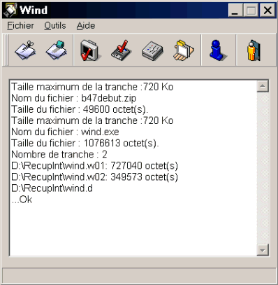 9238-UT Une disquette Freeware. Nom : Wind (Genos S., Perrysoft) Matière : utilitaire. Niveau : outil pour le prof. et les autres. Wind est un utilitaire permettant de découper un gros fichier, comme un fichier compressé (ZIP par exemple) ou un exécutable (EXE), en plusieurs petits fichiers (de 50 Ko à 650 Mo). |