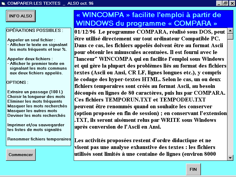 9411-FR Une disquette Shareware. Nom : COMPARA (Malandain J.L.) Matière : français. Niveau : tout niveau. Permet la comparaison de deux textes avec impression possible ou sauvegarde, le travail sur le vocabulaire et l'estimation de la difficulté de lecture. |