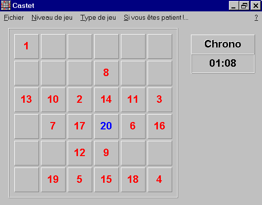 9412-JX Une disquette Shareware. Nom : CASTET (Chambily A.) Matière : jeu. Niveau : tous public. Jeu de stratégie : placer un maximum de nombres entiers consécutifs dans une grille carrée (taille suivant niveau) en respectant la règle de déplacement décrite. |