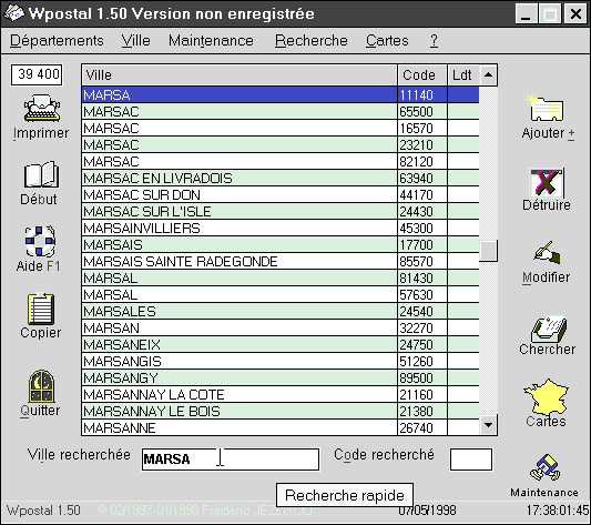 9414-DI Deux disquettes Shareware. Nom : WPOSTAL 1.50 (Jézégou F.) Matière : divers. Niveau : tous public. WPOSTAL. est un outil de gestion des codes postaux français. Livré avec une base de données complète, 39 400 données générales - 2 054 lieux dits et 37 346 villes. Il permet de retrouver n'importe quel code postal, ou inversement une ville à partir d'un code (recherches par Codes, Noms ou Multicritère). |