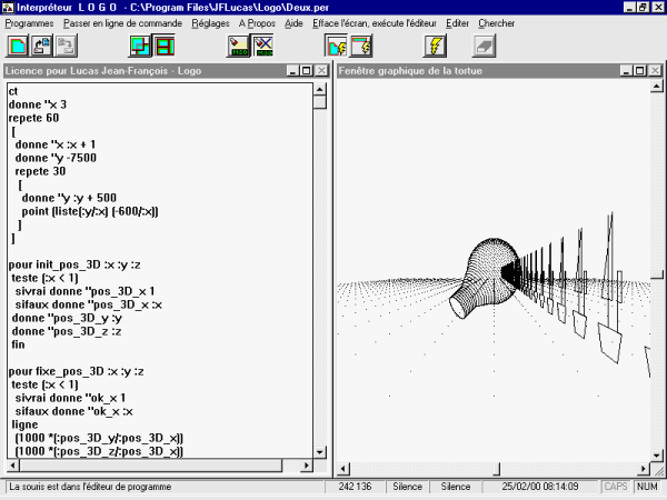9417-IF Deux disquettes Shareware. Nom : JFLOGO (Lucas J.F.) Matière : Informatique, programmation, Logo. Niveau : école, collège, lycée. Il s'agit d'un vrai Logo qui dispose de 140 instructions pour traiter graphisme (1000x1000 pixels 256 coul., 3D, perspective), sons (musique et voix), nombres, listes... et la récursivité. L'aide en ligne est claire et complète. Le formateur débutant y trouvera une progression de jeux pour débuter le pilotage de la tortue avec les enfants. Logo est un environnement de productivité pour l'élève. La simplicité de l'interface permet son utilisation dès le CP. La puissance de son langage structuré et récursif permet d'intéresser les collégiens, les lycéens et même au-dela. |