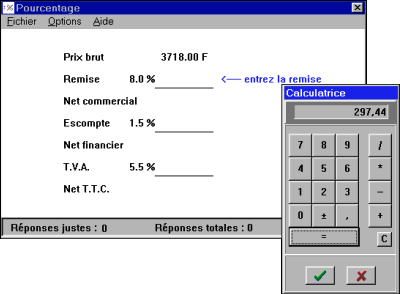 |  | 6225-MA   Une disquette Freeware. Nom : POURCENT (Le Du G.) Matière : maths. Niveau : collège, lycée prof.. Comme son nom l'indique, pourcent.exe est un logiciel d'entraînement au calcul des pourcentages, direct et indirect. Il s'agit exclusi-vement de pourcentages liés aux calculs commerciaux : remise et TVA. Sept niveaux, on a accès à la calculatrice de Windows. |