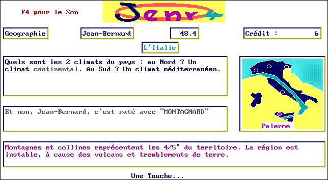6310-JX Une disquette Shareware. Nom : JENNY 4 (Bataille J.P.) Matière : jeu éducatif. Niveau : collège 4e et plus. Jeu éducatif de 1 100 questions tirées de 7 matières scolaires, 275 illustrations, 750 commentaires et des divertissements. Nombreuses options, un ou plusieurs joueurs. |