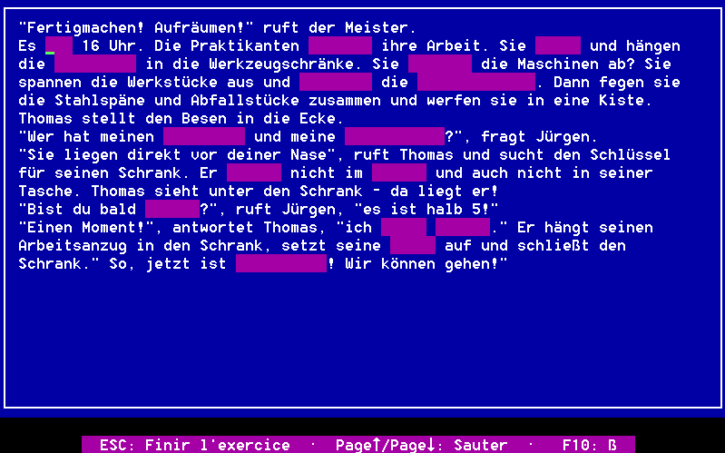 6311-EX Une disquette Shareware. Nom : LERNEN 1.2 (Kneipp E., Wher M.) Matière : exerciseur. Niveau : collège, lycée. Apprentissage, entraînement et évaluation du vocabulaire. Possibilité d'utiliser ses propres textes. Caractères multinationaux. Un exemple est fourni en Allemand. |