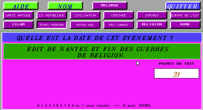 6313-HG Une disquette Shareware. Nom : HISTODATE (Garau L.) Matière : histoire. Niveau : collège, lycée. Questionnaire portant sur des dates d'événements historiques (la notation tient compte de l'écart à la date exacte). Sont proposées les rubriques : Grèce antique, IIIe République, Civilisations, Croisade, Empires, Europe de l'est, Islam, Temps modernes, Moyen âge, Peu connus, Religion, Rome, Mélange. |
