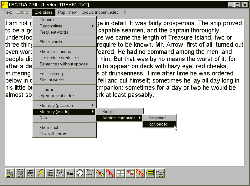 6414-AN Une disquette Shareware. Nom : LECTRA US (Brun M.) Matière : anglais. Niveau : collège, lycée. Lectra est un logiciel d'entraînement systématique à la lecture, qui propose un ensemble d'exercices variés : closure, reconstitution de textes, lecture rapide... |