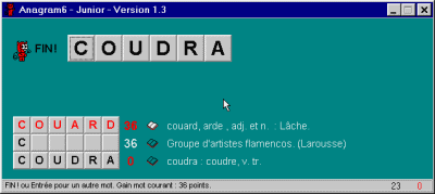 9615-FR Une disquette Shareware limité. Nom : ANAGRAM6 (Buttet M.) Matière : français, jeu. Niveau : tout niveau à partir du CM. L'ordinateur affiche un mot de six lettres ou six lettres dans l'ordre alphabétique, à vous de trouver son ou ses anagrammes. Pour vous aider, vous pouvez demander une définition ou une lettre. A mesure que votre score augmente, les mots deviennent plus difficiles... Comprend 25 000 formes et 5 000 définitions complètes, correspondant à tous les mots du Larousse, Petit Robert et Littré réunis. Cette version est limitée aux mots commençant par A, B, C. |